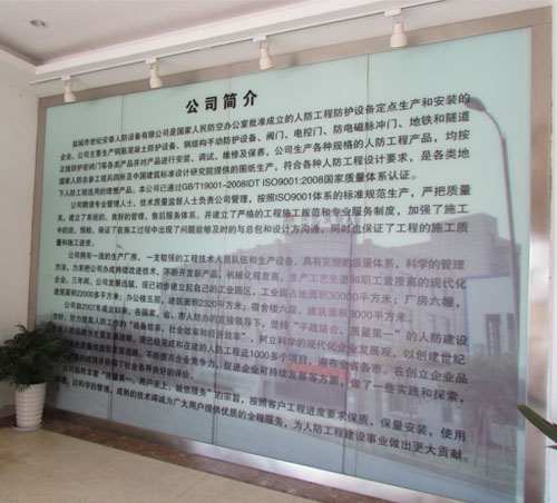 鹽城市世紀(jì)安泰人防設(shè)備有限公司是國(guó)家人民防空辦公室批準(zhǔn)成立的人防工程防護(hù)設(shè)備定點(diǎn)生產(chǎn)和安裝企業(yè),是專業(yè)生產(chǎn)、銷售、安裝人防防護(hù)設(shè)備產(chǎn)品的企業(yè),公司主要生產(chǎn)鋼筋混凝土防護(hù)設(shè)備、鋼結(jié)構(gòu)手動(dòng)防護(hù)設(shè)備、閥門、電控門、防電磁脈沖門、地鐵和隧道正線防護(hù)密閉門等各類產(chǎn)品并對(duì)產(chǎn)品進(jìn)行安裝、調(diào)試、維修及保養(yǎng),公司生產(chǎn)的各種規(guī)格的人防工程產(chǎn)品,均按國(guó)家人防總參工程兵四所及中國(guó)建筑標(biāo)準(zhǔn)設(shè)計(jì)研究院提供的圖紙生產(chǎn),符合各種人防工程設(shè)計(jì)要求,是各類地下人防工程選用的理想產(chǎn)品。本公司已通過(guò)GB/T19001-2008IDT ISO9001:2008國(guó)家質(zhì)量體系認(rèn)證。